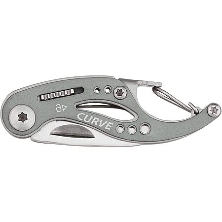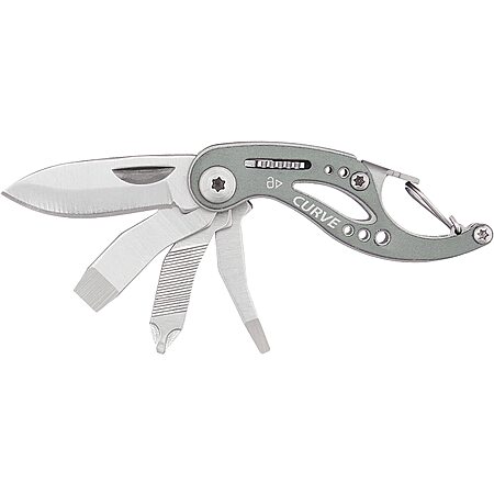 Includes screw drivers, a blade, file, can opener, and built-in carabiner clip