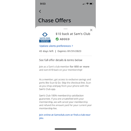 Chase Offers: sam's club. MEMBERSHIP OFFER ONLY. $10 back at Sam's Club