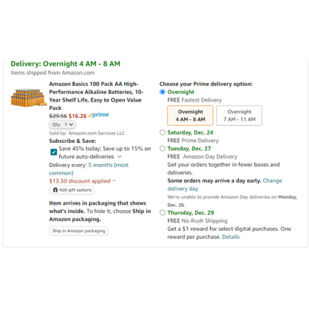 AmazonBasics 100 Pack AA Batteries $16.26 w/Targeted 45% S&S coupon