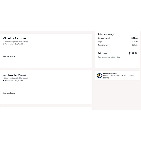 Aeromexico via Expedia have round trip airfares travelling from Miami (MIA) to San Jose Costa Rica (SJO) for $238, making 1 stop. Aeromexico is a Sky Team member and this fare includes 1 personal item and 1 free carry-on bag. There is no seat choice and no changes.