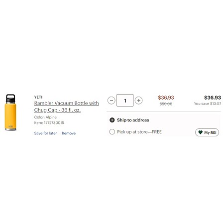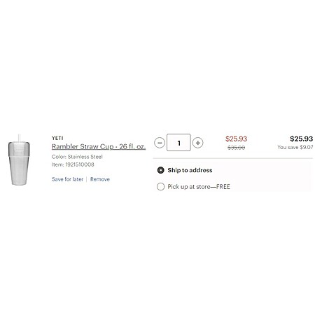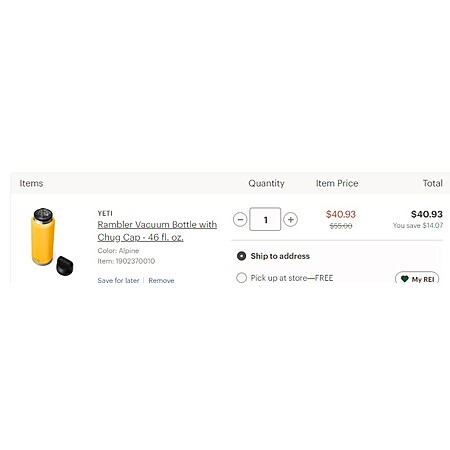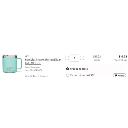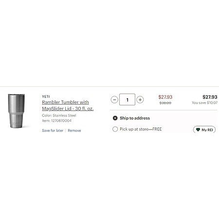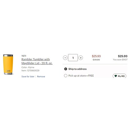 REI.com offers 25% Off select YETI Rambler Stainless Steel Cups & Water Bottles with prices starting at $17.93 (prices shown at checkout). Select free store pickup where stock permits. Otherwise, shipping starts at $5.99. Shipping is free for REI Co-op members ($30 lifetime membership) or free on $50+ orders for non-members.