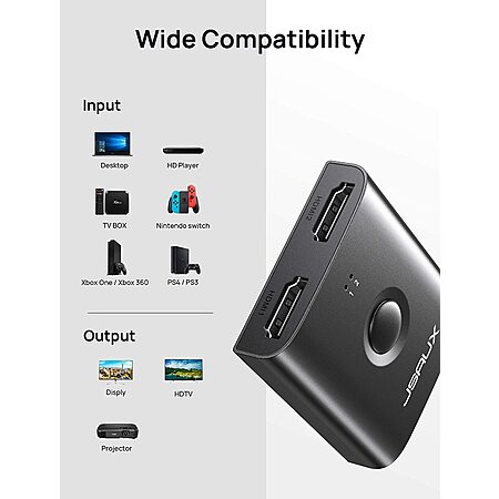 • Supports input: Computer, XBox 360, XBox One, PS4, Ps4 pro, Blu-Ray DVD, Switch, Route Roku, Chromecast, PC etc. Output devices: HD-Ready or Full HD TVs, Apple TV, projectors, monitors