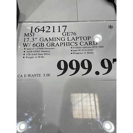 Costco MSI GE76 17.3" I7-12700H/16GB DDR5/1TB SSD/RTX 3060 $999.97