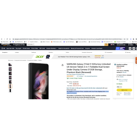 AMAZON|RENEWED|Excellent condition| 90 days return | SAMSUNG Galaxy Z Fold 3 5G Unlocked US Version | 512GB Storage $599 + tax