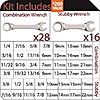 • (28) combination wrenches - metric: 6 mm, 7 mm, 8 mm, 9 mm, 10 mm, 11 mm, 12 mm, 13 mm, 14 mm, 15 mm, 17 mm, 18 mm, 19 mm, 21 mm, 22 mm and SAE: 1/4 in., 5/16 in., 11/32 in., 3/8 in., 7/16 in., 1/2 in., 9/16 in., 19/32 in., 5/8 in., 11/16 in., 3/4 in., 13/16 in., 7/8 in. and includes (16) stubby combination wrenches - metric: 10 mm, 12 mm, 13 mm, 14 mm, 15 mm, 17 mm, 19 mm, 22 mm and SAE: 3/8 in., 7/16 in., 1/2 in., 9/16 in., 5/8 in., 11/16 in., 3/4 in., 7/8 in.