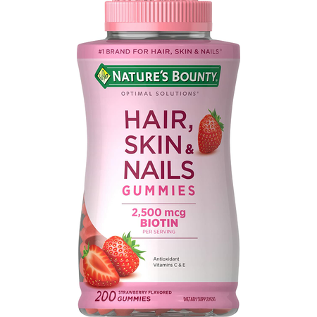 Size: 200 Gummies. From the #1 Brand for hair skin and nails (1), Nature's Bounty Hair, Skin & Nails Gummies are packed with biotin, and vital nutrients to support beautiful hair, glowing skin (2), and healthy nails (2) from the inside, out. Each serving of our delicious strawberry-flavored biotin gummies contain antioxidants Vitamins E and Vitamin C. Vitamin E contributes to skin health (2), and Vitamin C is involved in collagen production and formation, which forms the basis for vibrant skin, whereas biotin helps to maintain healthy hair (2). For additional wellness benefits, our unique formula is laboratory tested and includes no milk, lactose, soy, gluten, wheat, yeast, and fish. If you're hoping to look and feel your best, Nature's Bounty Hair, Skin & Nails vitamins for women are a great way to support your natural beauty from within.