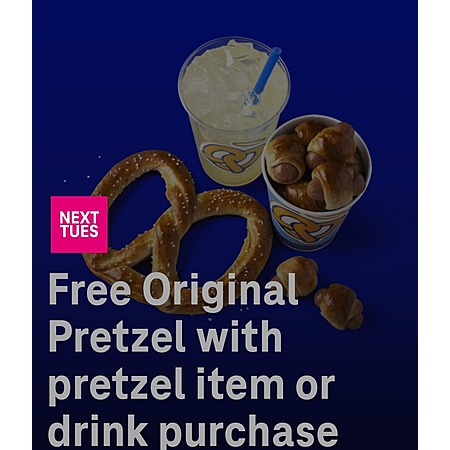 Get a free Auntie Anne's Original Pretzel with the purchase of a pretzel item or drink. Plus tax.