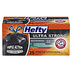 Amazon [amazon.com] has 25-Count 30-Gallon Hefty Ultra Strong Large Trash Bags (White Pine Breeze) for $8.52 - 5% when you checkout via Subscribe & Save - $2.56 when you 'clip' the coupon on product page = $5.53. Shipping is free w/ Prime or on $25+.