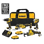 This ATOMIC Compact Series 20V MAX* Cordless Combo Kit includes one 1/2 in. Drill/Driver, 1/4 in. Impact Driver, One-Handed Reciprocating Saw, Oscillating Multi-Tool, charger, kit bag, and two 20V MAX* 2.0Ah batteries. The DCD708 Drill/Driver is compact at only 6.3 in. front to back, and its high-performance brushless motor delivers 340 unit watts out (UWO). The DCF809 Impact Driver features a high-performance brushless motor that delivers 1,700 in-lb of max torque. The DCS354 Oscillating Multi-Tool has a DUAL-GRIP variable-speed trigger that provides increased speed and application control. The DCS369 One-Handed Reciprocating Saw is lightweight at only 3.13 lbs., making it 37% lighter than the DCS367 Compact Reciprocating Saw (Tool Only).