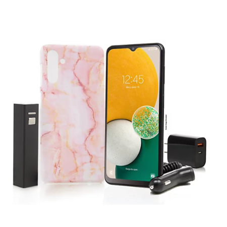 - Includes Samsung Galaxy A13 5G smartphone with one year of service/1,500 minutes/1,500 texts/1.5GB data; case, wall charger with USB-C cable, power bank, car charger, and voucher