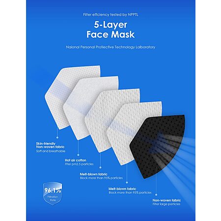 - This mask is made of 2 non-woven outer layers, 2 melt-blown inner filter, 1 non-woven fabric middle layer absorbing the moisture.