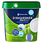 | Product Description: | Member's Mark Ultimate Clean Automatic Dishwasher Detergent Pacs are formulated with a special all-in-one formula that cleans your dishes in three distinct and powerful ways: it cleans dried-on food, eliminates the need to pre-wash and gives your glassware a crystal-clear shine. With these ultra-concentrated dishwasher pods, you know you're using the right amount of detergent every single time you run a load of dishes. No need to pre-rinse your dishes, as these single dose dishwasher detergent pacs remove 24-hour stuck on food and grease, while leaving behind a sparkling clean shine with a fresh scent. When you use the right amount of detergent, your dishes get clean and you aren't wasting money on extra, unnecessary detergent.Â