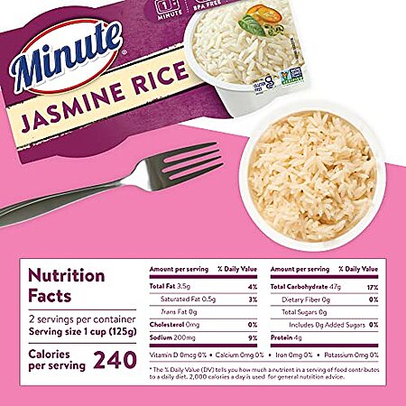 - These Jasmine rice cups contain no preservatives, are gluten-free, and are Non-GMO Project verified. They're also free of cholesterol and MSG.