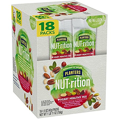 Amazon[amazon.com] has PLANTERS NUT-rition Heart Healthy Mix, 18 Count 1.5 Oz Packs for $17.99 or $17.09 w/ 5% Subscribe & Save. Shipping is free w/ Amazon Prime or on $25+