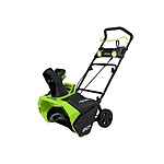 Features of Greenworks 40V 20-inch Cordless Brushless Snow Blower: • Up to 45 minutes of runtime with fully charged battery • Quickly clear your driveway, sidewalks, patios and more with a 20 in. clearing path • Quiet, maintenance free brushless motor technology • Clear more with 10 in. depth 180 degree rotating chute for desired snow displacement • Up to 20 ft. discharge • LED Lighting for better visibility • Easy fold system for compact storage and transportation • 6 in. rear wheels to maneuver in the toughest conditions • 3-year warranty What's Included: • (1) 40V 20 in. Snow Thrower • (1) 40V 4.0 Ah Battery • (1) Battery Charger • (1) Owner's Manual