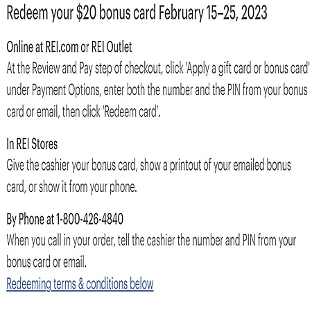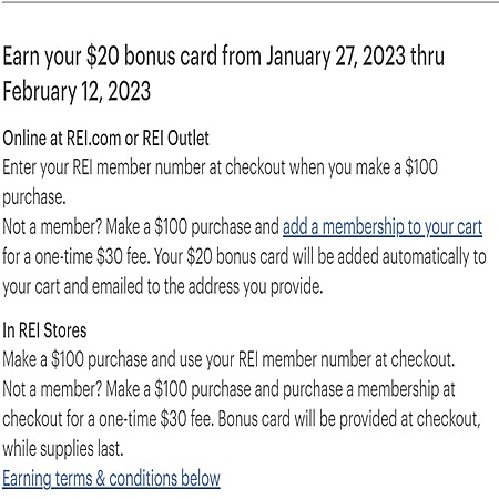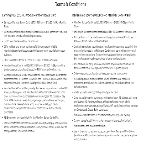 REI.com offers its Co-op Members: Make a $100+ Purchase, Get a $20 Bonus Card (see instructions below).