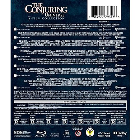 Seven-disc set includes: The Conjuring (2013)Before their fame as the Amityville paranormal investigators, Ed and Lorraine Warren (Patrick Wilson, Vera Farmiga) became embroiled in the terrifying plight of Roger and Carolyn Perron (Ron Livingston, Lili Taylor)-whose newly purchased farmhouse appeared to have been haunted by vengeful spirits. To cleanse the house and protect the family, the Warrens dared to seek out the home's dark secrets. Eerie chiller from director James Wan co-stars Shanley Caswell, Hayley McFarland. 112 min. C/Rtg: R Annabelle (2014)Annabelle, the creepy doll from 2013's "The Conjuring," takes center stage in this fright-filled prequel. When John Form (Ward Horton) gives his wife Mia (Annabelle Wallis) a new doll for her collection, he has no idea the hell that's about to be unleashed. With Annabelle at the center of a series of bizarre occurrences, the Forms soon learn that the terrifying toy brings with it a demonic presence that's out to claim someone's soul. With Tony Amendola and Alfre Woodard. 98 min. C/Rtg: R The Conjuring 2 (2016)London, 1977: When the urlhasbeenblocked family begins to experience a series of strange and inexplicable supernatural events surrounding young Janet (Madison Wolfe), professional paranormal experts Ed and Lorraine Warren (Patrick Wilson and Vera Farmiga) are called upon to investigate. Initially believing the girl is possessed by the spirit of a man who died in the house, the Warrens soon discover that there may be something far more evil at work. Frances O'Connor, Simon McBurney, Franka Potente also star in this spooky sequel. 134 min. C/Rtg: R Annabelle: Creation (2017)Back in the '50s, a dollmaker (Anthony LaPaglia) and his invalid wife (Miranda Otto) opened their home to a stranded nun (Stephanie Sigman) and the young girls in her charge. Unfortunately, the children came upon the disturbing doll that their host crafted in the image of the daughter he lost in a car accident... and soon afterwards, it's unholy secrets. Pulse-pounding origin prequel for the pernicious poppet of "The Conjuring" co-stars Talitha Bateman, Lulu Wilson, Philippa Coulthard. 110 min. C/Rtg: R The Nun (2018)In 1952, the quiet of a Romanian monastery was shattered by the suicide of a nun... and the Vatican put the investigation in the hands of exorcist Father Burke (Demián Bichir) and novitiate Sister Irene (Taissa Farmiga). They learn to their horror that a demonic entity stalks the abbey... and that their own lives and souls may soon be forfeit. Origin story/spin-off for the sinister soror of "The Conjuring 2" co-stars Jonas Bloquet, Ingrid Bisu, Charlotte Hope, and Bonnie Aarons as the Nun. 96 min. C/Rtg: R Annabelle Comes Home (2019)Set after the opening scenes of "The Conjuring," this chilling series installment finds demonologists Ed (Patrick Wilson) and Lorraine Warren (Vera Farmiga) locking deadly doll Annabelle up in their house for safe keeping in the early 1970s. But when Annabelle's case is opened, she unleashes a host of evil spirits, forcing the Warrens' young daughter Judy, (McKenna Grace), her babysitter Mary Ellen (Madison Iseman), and Mary Ellen's friend Daniela (Katie Sarife) to fight for their very survival. 106 min. C/Rtg: R The Conjuring: The Devil Made Me Do It (2021)Connecticut, 1981: Occult investigators Ed and Lorraine Warren (Patrick Wilson, Vera Farmiga) were on hand to document the exorcism of 8-year-old David Glatzel (Julian Hilliard). Ed, however, was certain that the demon fled into the body of David's sister's boyfriend, Arne Johnson (Ruairi O'Connor)-and after Johnson murdered his landlord, they'd face a perilous path in aiding his defense. Third franchise thriller also stars Sarah Catherine Hook, Ronnie Gene Blevins, John Noble. 112 min. C/Rtg: R