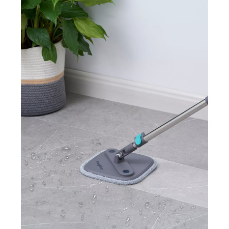 - Built-in brush cleans and scrubs the mop pad while it spins