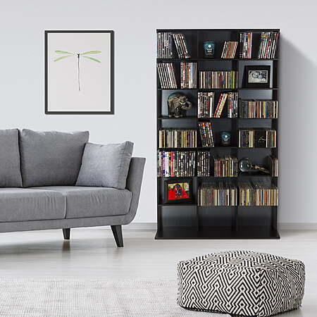 If storage/capacity is your concern and you have a large collection and care more about that (than the looks), I highly recommend the Atlantic Maxsteel shelves. These come as tall as 12-tiers (about 7 feet tall?) and hold about 500 blu-ray style cases per shelf. The issue with the wooden ones in OP are that they tend to be limited in height (so they don't fall over!) and if space is limited, they'll keep you from putting your full collection into a room. If you don't mind losing the wallspace, the steel shelves will go just below ceiling height in a normal 8 foot tall apartment/house and let you maximize the space