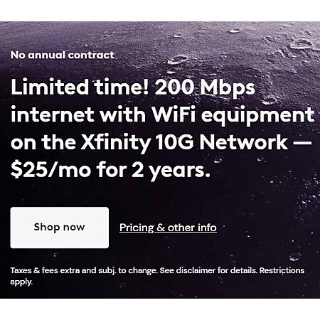 Xfinity 10G Network (200 Mbps Internet w/ WiFi equipment) for $25/month for 2-Years. No annual contract (New Residental Customers)