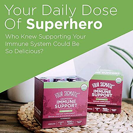 Model: Adaptogen Immune Support Shot by Four Sigmatic | Caffeine Free, Vegan Chaga Mushroom Shot | Organic Vitamin C Drink | Elderberry Shot for Immune System Support, Stamina and Endurance Aid | 6 Count