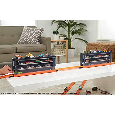 Connect the case directly to Hot Wheels tracks and watch cars race through the transparent windows where stored vehicles can be pulled into action at any time.