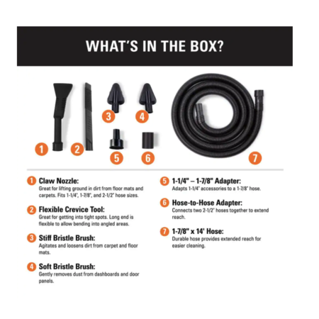 - 7-piece automobile cleaning kit includes a 1-7/8 in. x 14 ft. hose, a soft bristle brush, a stiff bristle brush, a flexible crevice tool, a multi-fit claw nozzle and adapters
