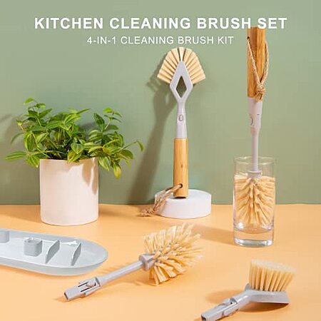 4-IN-1 BRUSH HEAD SET FOR KITCHEN: This kitchen cleaning brush comes with 3 types of brush heads and 1 compressed scrub sponge, which can meet your daily cleaning needs in the kitchen. Make it easier and faster for your daily household cleaning.