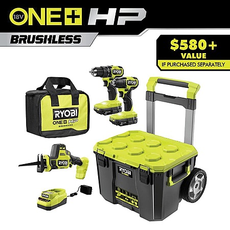 Ryobi One+ HP 18V 3-Tool Kit w/ LINK Rolling Tool Box, 2x 1.5A Batteries & Charger