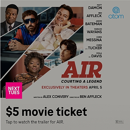 Score a $5 movie ticket from Atom Tickets to see AIR! Experience the must-see story of a partnership that revolutionized the world of sports and contemporary culture.