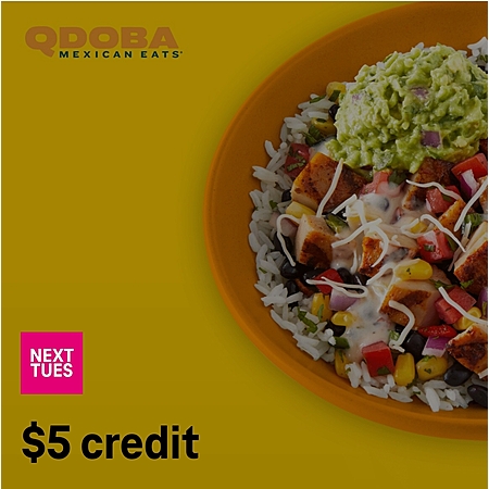 Treat yourself to a $5 QDOBA credit and devour hand-crafted, slow-cooked and flame-grilled flavor. Use your credit towards your favorite QDOBA Mexican-inspired menu item, or try something new!