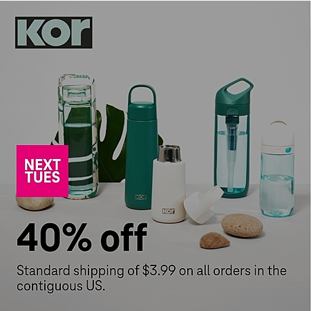 Sip on 40% off design-driven reusable water bottles and products from Kor. Standard shipping of $3.99 on all orders in the contiquous US