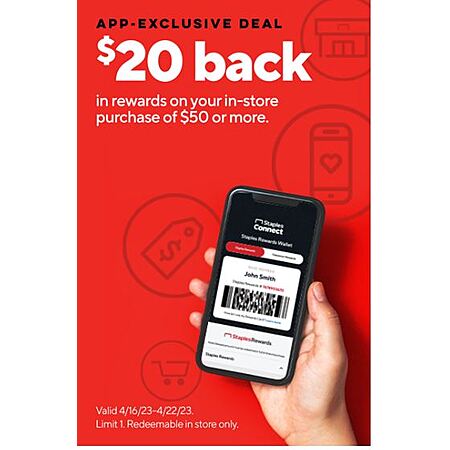 Staples B&M $20 back in rewards with purchase of $50 or more with app in store, from 4/16 -4/22