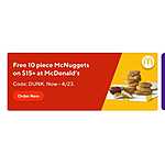 Saw this in the Doordash app today: Get a free 10-pc McNuggets with $15 delivery orders at McDonald's with code DUNK now through 4/23. Unfortunately, I can't find any eligibility terms for this offer, but you can check and see if this works for you.