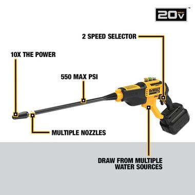 Description:- The DeWALT 20 Volt Max cordless power cleaner tool is perfect for portable cleaning on the jobsite or at home with 10X the cleaning power of a garden hose. User can handle a wide variety of cleaning tasks with 550 max PSI and 1.0 Gallon per minute. Versatile tool is precisely engineered to draw from any fresh water source with an included suction hose, when a garden hose is not easily accessible. It can be hooked up to your garden hose at home or on the jobsite with the convenient quick connect adaptor. This all-in-one device is great to clean tools and equipment as well as decks, boats, outdoor furniture and vehicles. It comes with 4 quick-connect nozzles that can all be stored on the unit, thus allowing user to find the right stream for the job. Cleaner tool also comes with a soap bottle to efficiently tackle a wide variety of cleaning tasks by adding detergent easily. Cleaner tool comes with a long wand with quick connect, turbo nozzle, 15 degree nozzle, 25 degree nozzle, 40 degree nozzle, soap bottle, suction hose, quick connect hose adaptor and a storage bag.