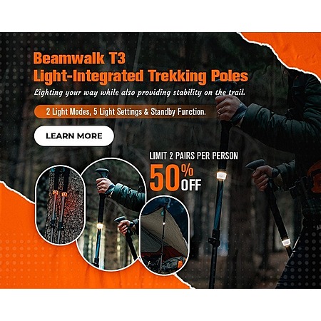 - 360-degree lighting trekking poles. Each light is equipped with a dual-color COB LED and a separate 1,300 mAh battery pack to deliver a max output of 120 lumens and 30 hours max runtime.
