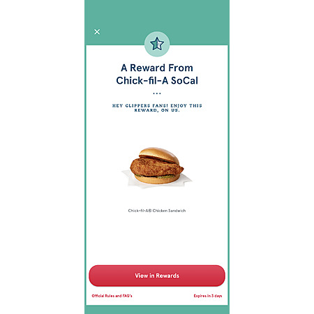 If you're located in the Greater LA or Orange County area in Southern California, log in to your Chick-fil-A app by 10:30AM PT, Friday, April 21, 2023, with location detection on to automatically claim another free Chick-fil-A Original Chicken Sandwich, courtesy of the LA Clippers' opponent missing two consecutive free-throws in the 4th quarter of a Clippers home game. Once the reward is claimed, you will have until Monday to redeem it.