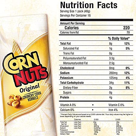 Corn Nuts Original Crunchy Corn Kernels deliver that delicious flavor you love along with the irresistible crunch you can't get enough of. Keep a pack of roasted corn nuts by your side to curb those snack cravings when on the go. Always a hit with your family, our corn nuts pair perfectly with everything and they're sprinkled with salt to enhance the flavor. Each 1.7-ounce bag of Original Corn Nuts contain 220 calories, and they're perfect for those keeping Kosher. Our 18-count box of individual snack size packs offers convenience so you can enjoy Corn Nuts whenever the time is right.
