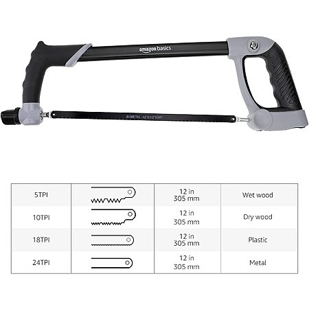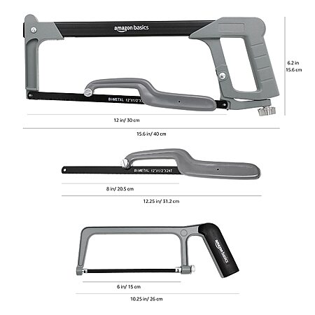 Model: Amazon Basics 3-Piece Aluminum Hacksaw Set with Bi-Metal Hacksaw Blades - 24 TPI (6-inch, 8-inch and 12-inch)