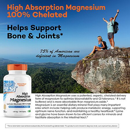 • Doctor's Best High Absorption Magnesium supports bone density, helps maintain a normal, regular heartbeat and supports overall cardiovascular health