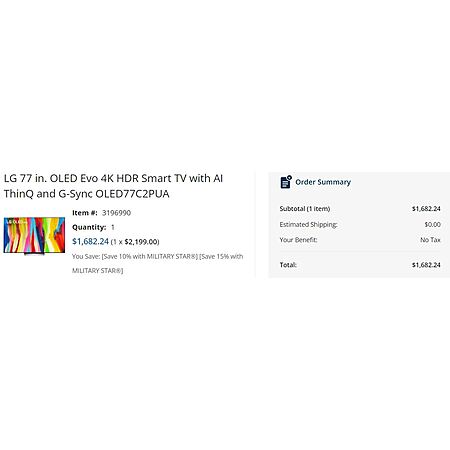 For the 77" TV, the original price is $2199.00 when added to the cart. During check out, select your Military Star card, additional discounts will be applied which will bring the price down to $1682.24 - no tax and free shipping!