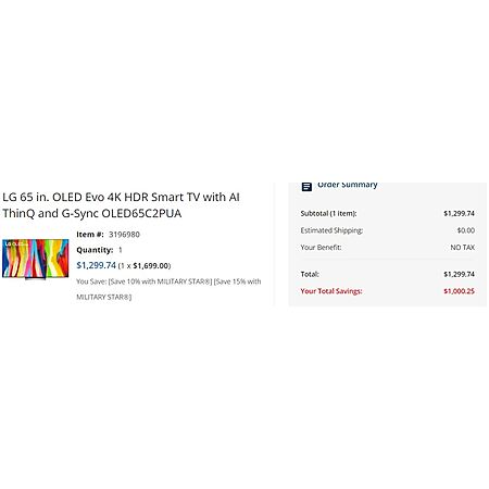 For the 65" TV, the original price is $1699.00 when added to the cart. During check out, select your Military Star card, additional discounts will be applied which will bring the price down to $1299.74 - no tax and free shipping!