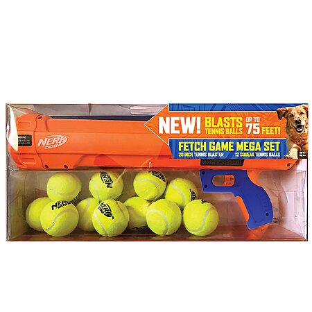 Model: Nerf Dog Fetch Game Mega Set Dog Toy, Includes 20 Inch Tennis Ball Blaster and 12 Squeak Tennis Balls