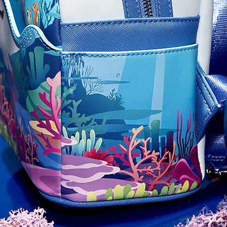 Featuring incredible detail to bring Nemo and Friends to life, this Loungefly mini backpack is made of vegan leather (polyurethane), has a front zipper compartment, side pockets, and adjustable back straps.