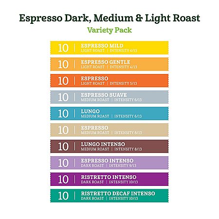 Model: Amazon Fresh Intenso Dark, Medium & Forte Light Roast Aluminum Capsules, Variety Pack, Compatible with Nespresso Original Brewers, 50 Count (5 Packs of 10)