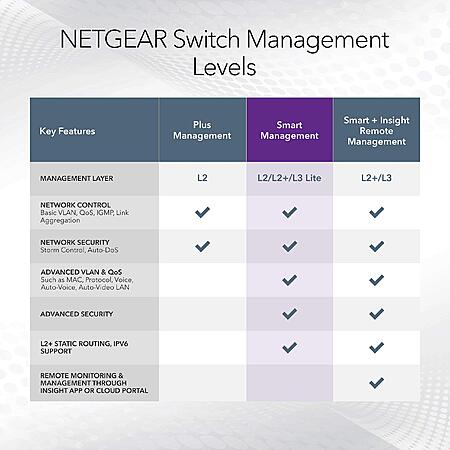 - Smart software with easy-to-use interface offers managed control for secure setup, access, and SNMP (NMS 300) management.
