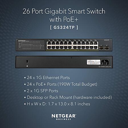 NETGEAR 26-Port PoE Gigabit Ethernet Smart Switch (GS324TP) - Managed, with 24 x PoE+ @ 190W, 2 x 1G SFP for $261.37 -