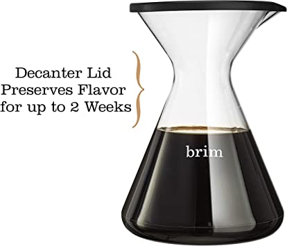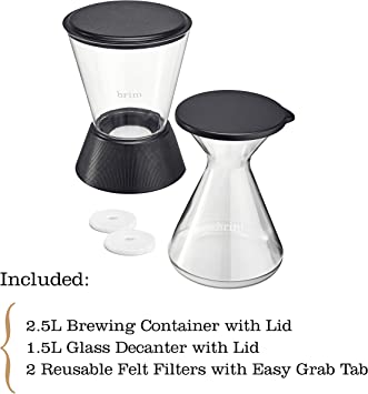 - PRESERVES FLAVOR: This cold brew maker includes a 2. 5 liter brewing container with lid that preserves flavor while brewing & prevents top of coffee bed from drying out & a1. 5 liter glass decanter with lid that preserves flavour & repels refrigerator odor
