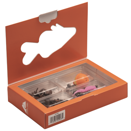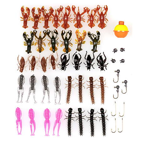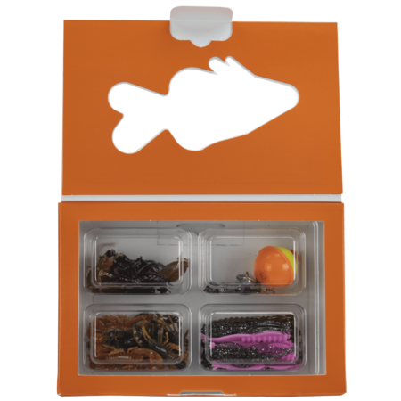 This kit Includes 14 unrigged crawfish, 8 unrigged hellgramites, 8 unrigged crickets, 8 unrigged pad hoppers, 1 3/4-inch float, 4 size 4 hooks, 4 split shots, and 3 1/16oz unpainted jig heads.