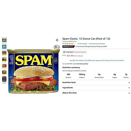 Spam Classic, 12 Ounce Can (Pack of 12) $21.39